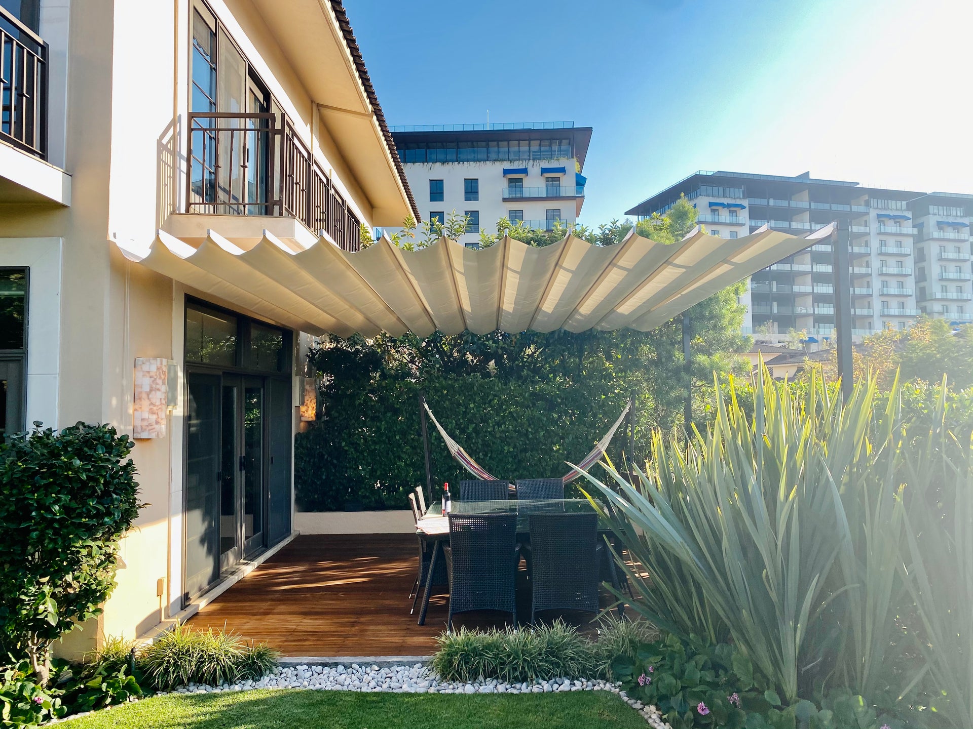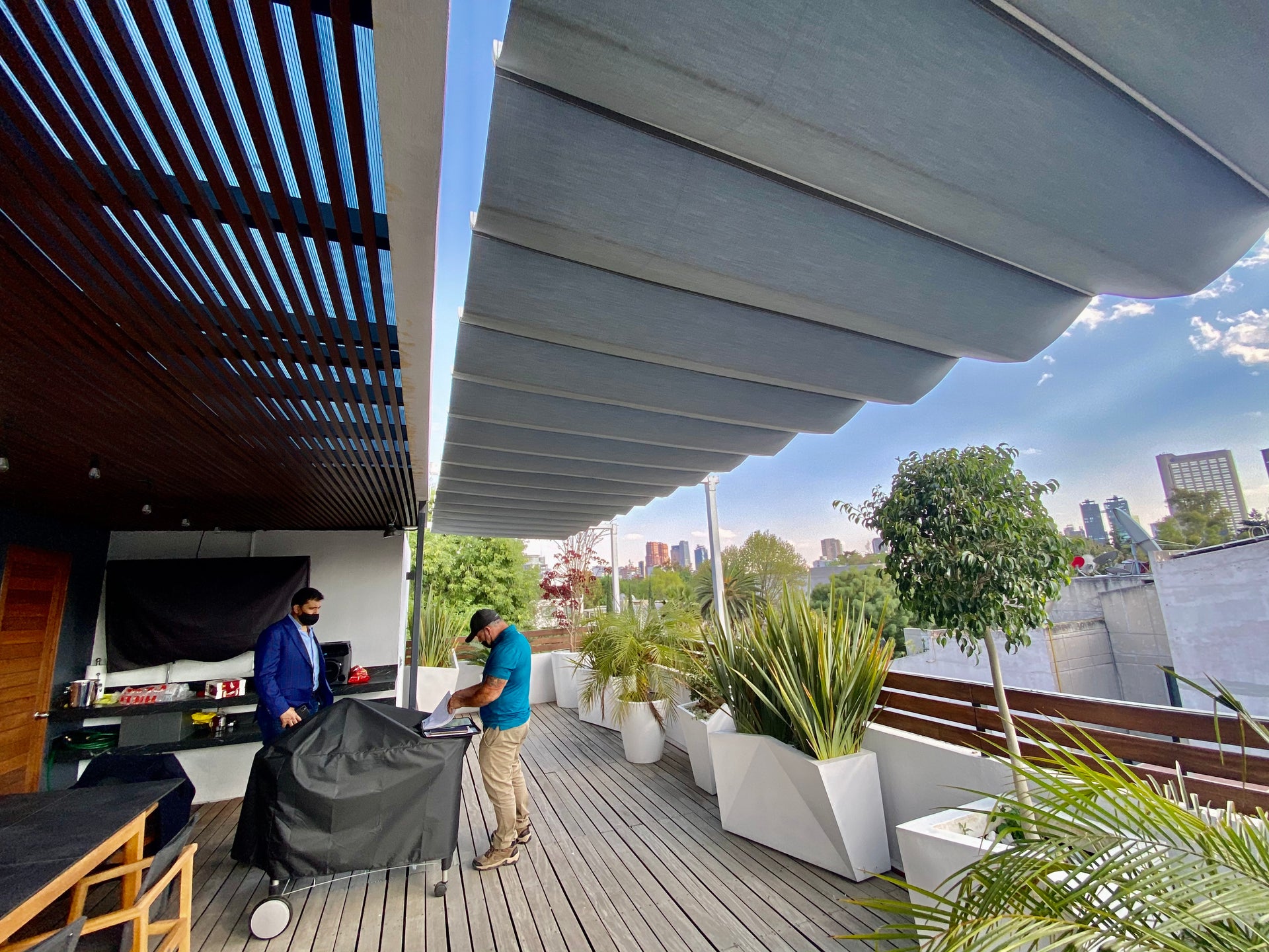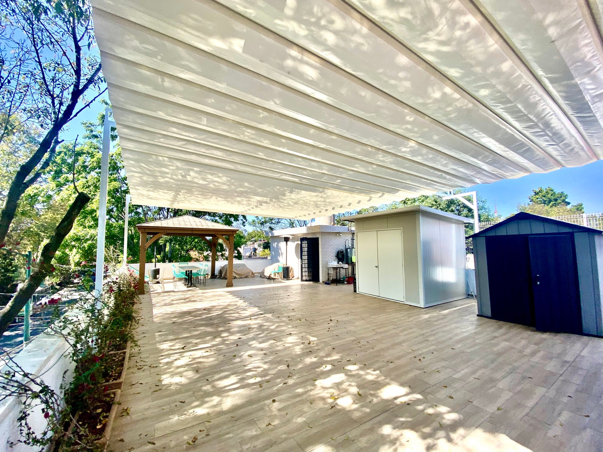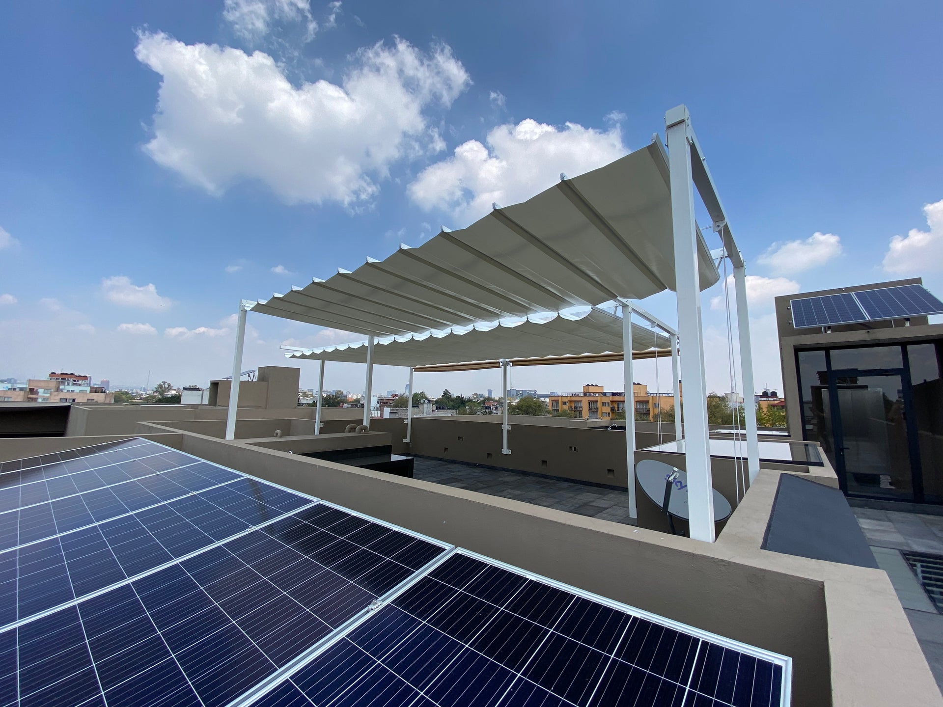 Sistema retráctil y versátil que crea áreas protegidas del sol en espacios abiertos. Consiste en una estructura de perfiles o palillos que sostienen lienzos flexibles y ajustables, permitiendo controlar la cantidad de sombra deseada. Es una solución práctica y estética para disfrutar del de lugares al aire libre. Funciona en diferentes entornos, desde residencias y restaurantes hasta terrazas y áreas comerciales.